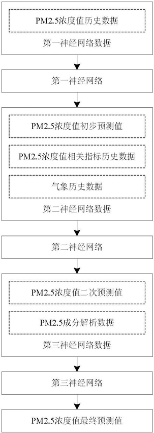 步骤3.6、将所述第二神经网络测试数据输入到所述训练完成的第二神经网络中,输出PM2.5浓度值的二次预测值,将所述PM2.5浓度值的二次预测值和PM2.5成分解析数据合并作为第三神经网络输入数据;