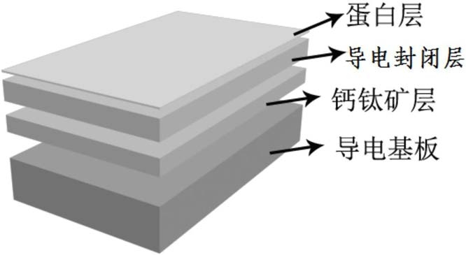 2.如权利要求1所述的用于可见光致细胞收割的钙钛矿复合薄膜器件的制备方法,其特征在于,包括如下步骤:在洁净的导电基板上采用旋涂法制备钙钛矿层,干燥后在钙钛矿层上制备导电封闭层,将所得样品放入蛋白溶液中浸泡,在导电封闭层上物理吸附获得蛋白层,所述的蛋白溶液为牛血清白蛋白溶液、纤连蛋白溶液、胶原蛋白溶液。