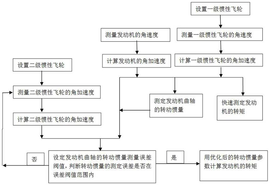 (5)根据测量工况需要设定发动机曲轴转动惯量的测量误差阀值,利用测定的二级惯性飞轮与一级惯性飞轮两者的转动惯量的差值,判断转动惯量的测定结果是否的在误差阀值范围内;如果分别利用二级惯性飞轮与一级惯性飞轮测出的转动惯量的差值的绝对值小于等于误差阀值,则满足测量要求进入下一步;如果利用二级惯性飞轮和一级惯性飞轮测出的转动惯量的差值大于等于误差阀值,给二级惯性飞轮减小一个测试单位,返回步骤(2),再测量二级惯性飞轮的角速度,按流程进行;如果二级惯性飞轮和一级惯性飞轮测出的转动惯量的差值小于等于负误差阀值,给二级惯性飞轮增大一个测试单位,返回步骤(2),再测量二级惯性飞轮的角速度,按流程进行;