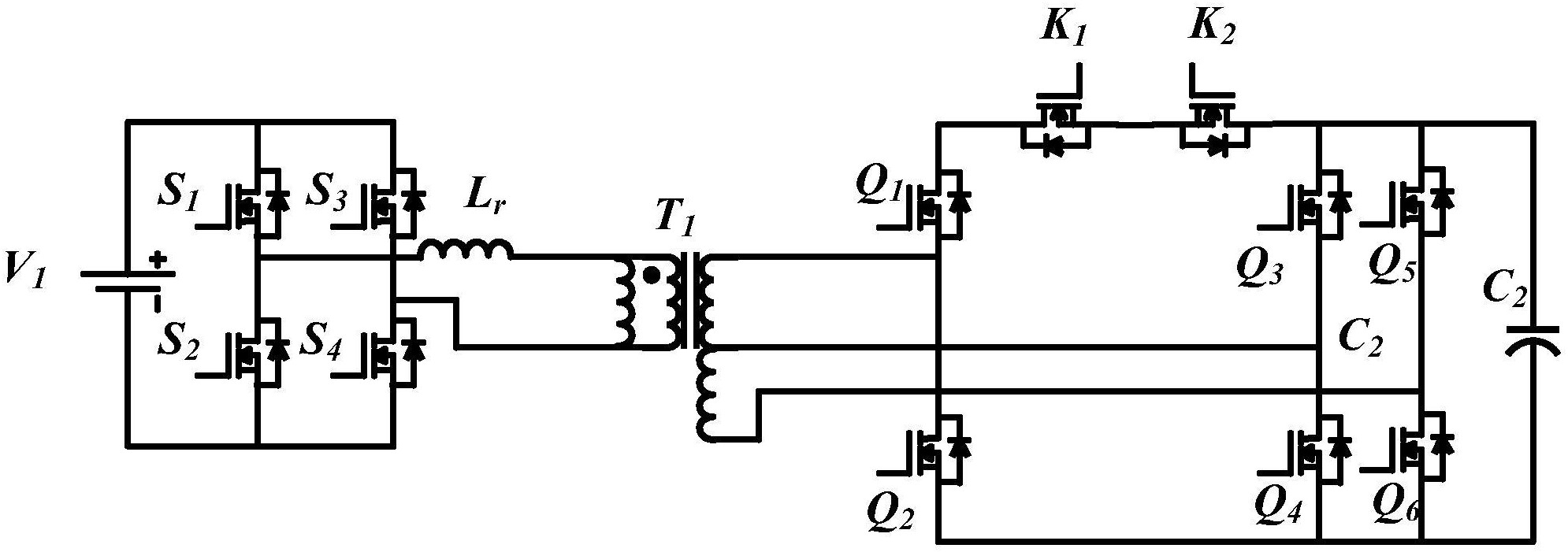 所述的第一开关管S1的漏极、第三开关管S3的漏极、电源V1的正极连接,第二开关管S2的源极与第四开关管S4的源极、电源V1的负极连接,第一开关管S1的源极、第二开关管S2的漏极、第一电感Lr的一端相连,第一电感Lr的另一端与三绕组变压器T1原边的一端相连,三绕组变压器T1原边的另一端、第三开关管S3的源极、第四开关管S4的漏极相连;三绕组变压器T1副边侧的第一抽头、第五开关管Q1的源极、第六开关管Q2的漏极相连,第五开关管Q1的漏极、第九开关管K1的漏极相连,第九开关管K1的源极、第十开关管K2的源极相连,第十开关管K2的漏极、第七开关管Q3的漏极、第十一开关管Q5的漏极、极性电容C2的正极相连,作为变压器副边侧电源的正极,三绕组变压器T1副边侧的第二抽头、第七开关管Q3的源极、第八开关管Q4的漏极相连,三绕组变压器T1副边侧的第三抽头、第十一开关管Q5的源极、第十二开关管Q6的漏极相连,第六开关管Q2的源极、第八开关管Q4的源极、第十二开关管Q6的源极、极性电容C2的负极相连,作为变压器副边侧电源的负极。