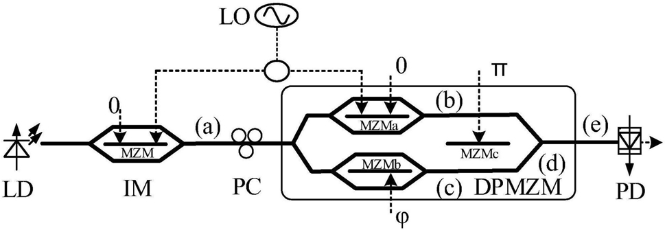 4.根据权利要求1所述的“一种利用强度调制器IM和双平行马赫增德尔调制器DPMZM级联产生八倍频毫米波的方法”,其特征在于:所述DPMZM调制器的MZM-b不加射频信号,只加直流偏置。
