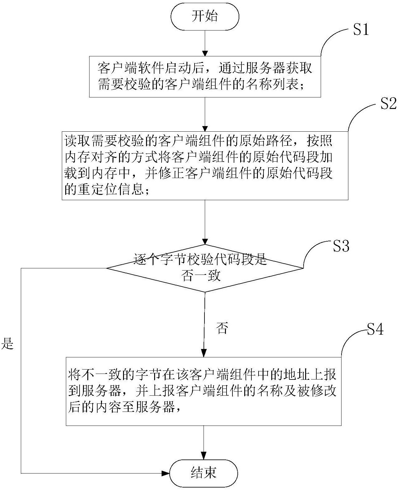 S3,获取客户端软件运行时加载到内存的地址,读取客户端软件加载到内存中的代码段,将客户端软件加载到内存中的代码段与原始代码段进行逐个字节进行校验;若校验不一致,进步骤S4,若校验一致,结束;
