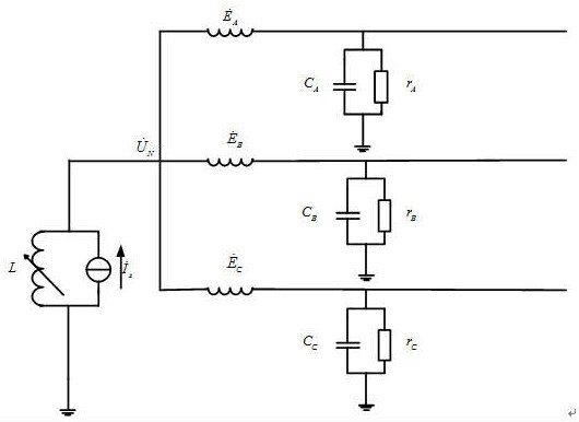 其中,C∑=CA+CB+CC为系统总的对地电容, 为系统总的绝缘电导,L为消弧线圈电感;根据电网参数(系统对地总电容、投入的消弧线圈电感、对地总电导)计算Y和相角β;