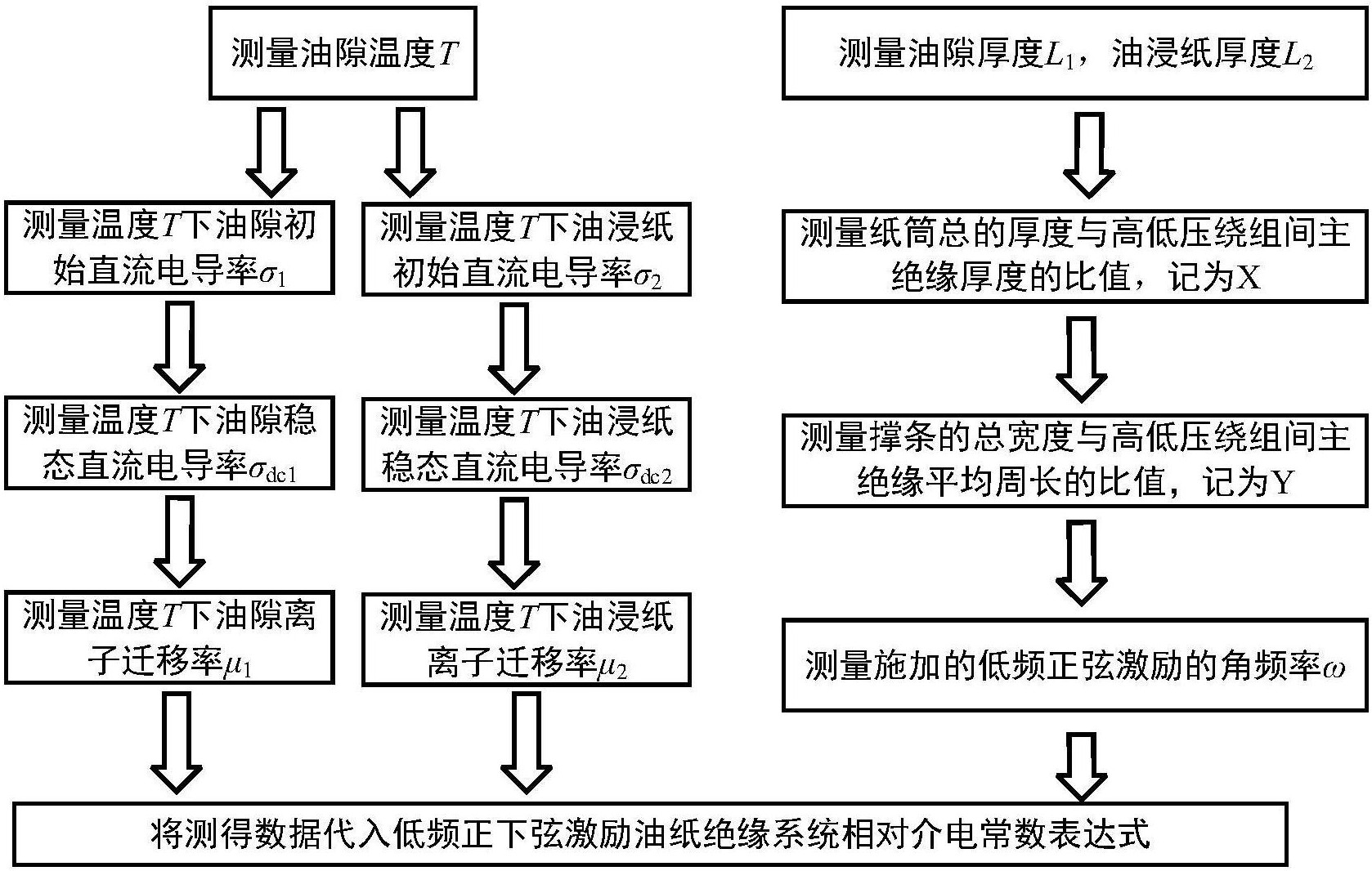 2.根据权利要求1所述的一种低频正弦激励下油纸绝缘系统相对介电常数的测试方法,其特征在于:其中油隙与油浸纸相对介电常数实部与虚部的表达式分别为:式中,ε'o为油隙相对复介电常数实部,ε”o为油隙相对复介电常数虚部,ε'p为油浸纸相对复介电常数实部,ε”p为油浸纸相对复介电常数虚部,T为油纸绝缘系统的温度,单位开尔文,e为单位电荷带电量,k=1.38×10-23J/K为玻尔兹曼常数,εr_o=2.2为变压器油工频相对介电常数,εr_p=4.5为油浸纸工频相对介电常数,ε0=8.85×10-12F/m为真空介电常数,σ1为油隙的初始直流电导率,σdc1为油隙的稳态直流电导率,μ1为油隙的离子迁移率,σ2为油浸纸的初始直流电导率,σdc2为油浸纸的稳态直流电导率,μ2为油浸纸的离子迁移率,L1为油隙厚度,L2为油浸纸厚度,ω为施加低频正弦激励的角频率。