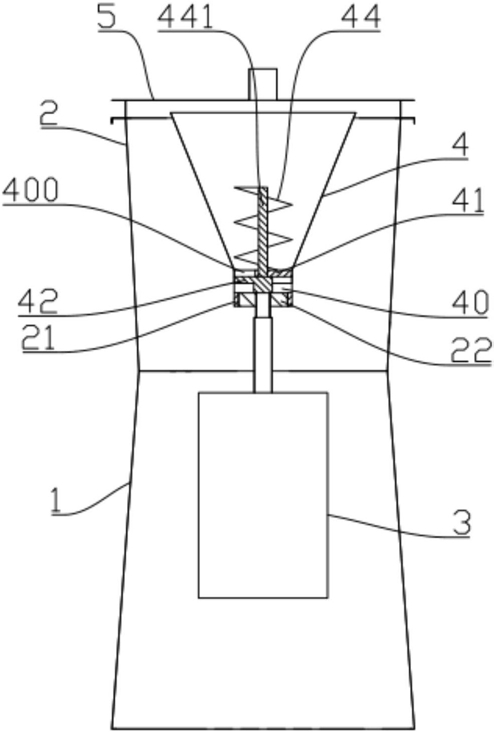 1.粉碎研磨机,包括机座、研磨杯以及杯盖,所述的研磨杯安装于机座的顶部,所述的杯盖盖合于研磨杯的上部开口,所述的机座内设有研磨电机,其特征在于:所述的研磨杯的内部设有进料斗,所述的进料斗的底部设有研磨组件,所述的研磨组件包括互相配合的静磨头和动磨头,所述的静磨头固设在所述的进料斗上,所述的动磨头布置在静磨头的中空腔内,并且与研磨电机的输出轴固接;所述的进料斗中位于研磨组件的上方设有固定挡板,所述的固定挡板的部分侧边与进料斗的侧壁连接,所述的固定挡板的另外部分侧边与进料斗的侧壁围合构成出料口,所述的出料口处设有可旋转的活动挡板,所述的活动挡板贴合于所述的固定挡板,所述的活动挡板旋转将所述的出料口间歇性打开或关闭;所述的活动挡板的下方与所述的动磨头之间形成有用于防止堵料的空腔;所述的进料斗中设有螺旋刀片,所述的螺旋刀片的刀轴穿过固定挡板后与活动挡板固定连接,所述的螺旋刀片与活动挡板同轴且同步旋转。