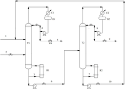 1.一种萃取精馏分离甲苯和正丁醇混合物的方法,其特征在于该方法所使用的装置主要包含如下组成部分:萃取精馏塔(T1)、萃取剂回收塔(T2)、冷凝器(C1)、冷凝器(C2)、回流罐(D1)、回流罐(D2)、再沸器(R1)、再沸器(R2);其中再沸器(R1)和再沸器(R2)分别连接在萃取精馏塔(T1)和萃取剂回收塔(T2)塔底,冷凝器(C1)和回流罐(D1)依次连接在(T1)塔顶,冷凝器(C2)和回流罐(D2)依次连接在萃取剂回收塔(T2)塔顶;