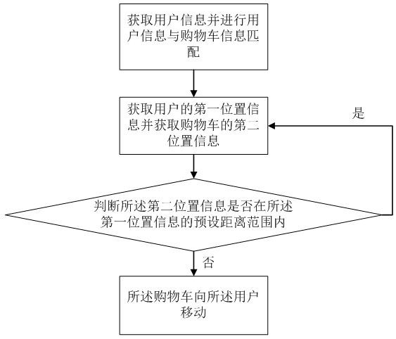 获取用户信息并进行用户信息与购物车信息匹配;获取用户的第一位置信息并获取购物车的第二位置信息;当所述第二位置信息不在所述第一位置信息的预设距离范围内,所述购物车向所述用户移动;若检测到有多用户在使用多购物车,则生成多导航路径;计算获取各个购物车在各个导航路径中每个时刻的位置;若有两个或两个以上购物车在相同时刻的位置相同,则通过生成导航路径的时间顺序决定其优先级,并让优先级高的购物车提前通过位置相同的地方;若所述用户输入准备购买的商品信息;停止所述购物车向所述用户移动的步骤,由所述购物车根据所述商品信息获取对应商品的位置信息,所述购物车向所述位置信息移动并进行购物;当完成自动购物后,判断所述第二位置信息是否在所述第一位置信息的第二预设距离范围内,若否,将所述商品快递到所述用户的住址处。