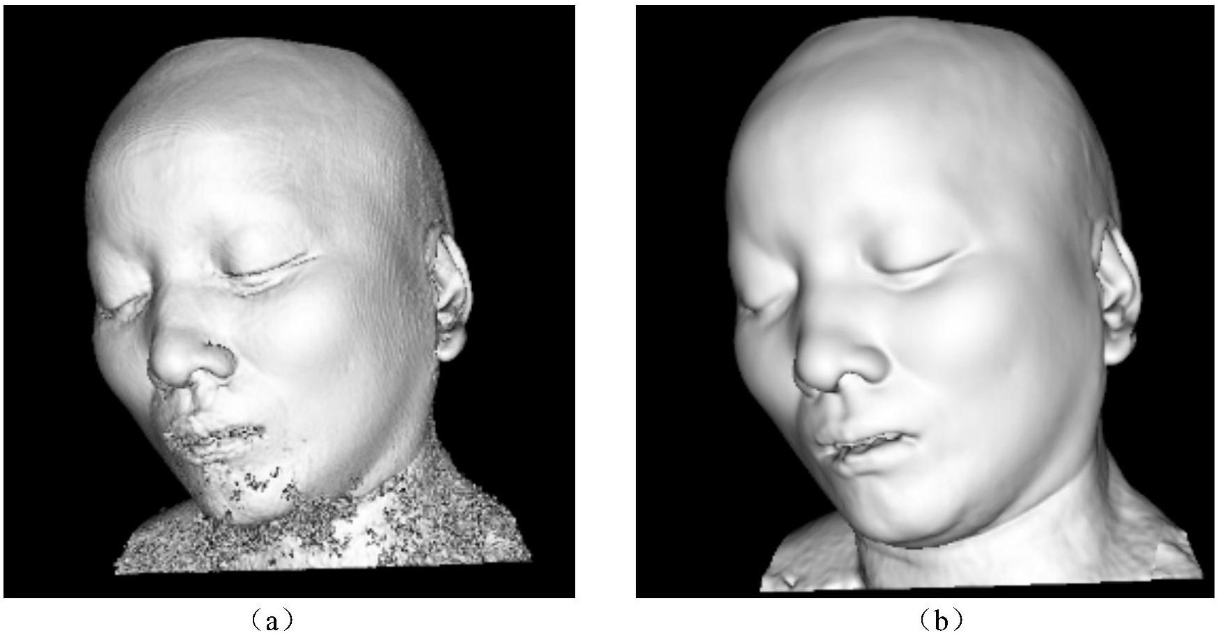 3.如权利要求2所述的一种基于核磁共振图像的面部皮肤三维重建方法,其特征在于:所述面部皮肤三维重建方法还包括以下步骤:4)面部下巴孔洞填补,过程如下:孔洞填充方法为:寻找边界棱,然后把边界棱首尾连接,这些连接的边界棱便组成了一个孔洞,孔洞填充操作为对孔洞进行三角划分,加入新的三角面片来完成孔洞的填充。