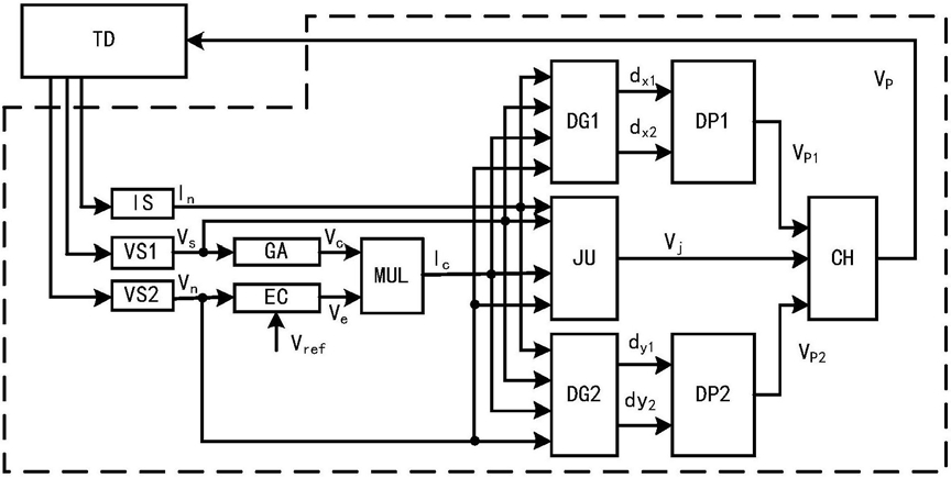 3.一种功率因数校正变换器均值电流控制装置,其特征在于:包括电流检测电路IS、第一电压检测电路VS1、第二电压检测电路VS2、补偿器EC、放大器GA、乘法器MUL、第一占空比生成器DG1、第二占空比生成器DG2、第一脉宽调制器DP1、第二脉宽调制器DP2、判断器JU和选择器CH;第一电压检测电路VS1、放大器GA、乘法器MUL依次相连;第二电压检测电路VS2、补偿器EC、乘法器MUL依次相连;电流检测电路IS与第一占空比生成器DG1、判断器JU、第二占空比生成器DG2分别相连;第一电压检测电路VS1与第一占空比生成器DG1、判断器JU、第二占空比生成器DG2分别相连;第二电压检测电路VS2与第一占空比生成器DG1、判断器JU、第二占空比生成器DG2分别相连;乘法器MUL与第一占空比生成器DG1、判断器JU、第二占空比生成器DG2分别相连;第一占空比生成器DG1、第一脉宽调制器DP1、选择器CH依次相连;判断器JU与选择器CH相连;第二占空比生成器DG2、第二脉宽调制器DP2、选择器CH依次相连。