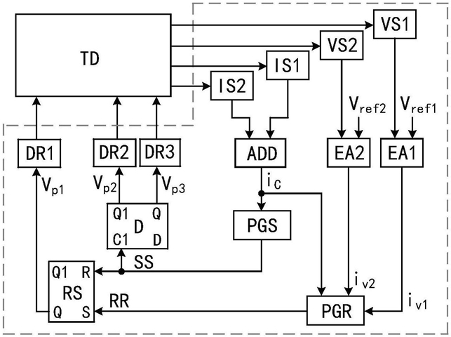 3.根据权利要求2所述的装置,其特征在于:所述的第一脉冲产生器PGR包括第一比较器CMP1和第二比较器CMP2,以及或门OR;第一误差放大器EA1的输出端和加法器ADD的输出端分别连接到第一比较器CMP1的输入端,第二误差放大器EA2的输出端和加法器ADD的输出端分别连接到第二比较器CMP2的输入端;比较器CMP1和CMP2的输出端分别连接到或门OR的输入端。