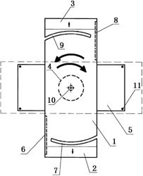 1.一种方便车辆上下的升降旋转载车板,由载车板主体(1)、上斜坡板(2)、下斜坡板(3)、旋转驱动机构(4)、升降托架(5)组成,其特征是:在载车板主体(1)的一个侧边上有纵向伸出的第1边梁(6),所述第1边梁(6)与上斜坡板(2)的侧部相接,载车板主体(1)与上斜坡板(2)之间存在着第1扇环形空隙(7);在载车板主体(1)的另一个侧边上有纵向伸出的第2边梁(8),所述第2边梁(8)与第1边梁(6)的伸出方向相反,第2边梁(8)与下斜坡板(3)的侧部相接,载车板主体(1)与下斜坡板(3)之间存在着第2扇环形空隙(9);载车板主体(1)通过一个转轴(10)安装在升降托架(5)上面,在载车板主体(1)与升降托架(5)之间安装旋转驱动机构(4),在升降托架(5)的四个角安装有升降索(11);在旋转驱动机构(4)作用下,载车板主体(1)、上斜坡板(2)、下斜坡板(3)围绕着转轴(10)的轴心线做水平旋转;