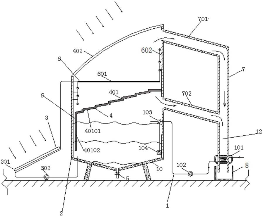 7.如权利要求3所述的太阳能双级加热海水淡化装置,其特征在于,所述冷凝机构(7)设置在所述晒水池(2)的外壁上,冷凝机构(7)包括第一冷凝管道(701)和第二冷凝管道(702),第一冷凝管道(701)与所述晒水池(2)内的吸热板(401)的上方空间连通,第二冷凝管道(702)与所述晒水池(2)内的吸热板(401)的下方空间连通。