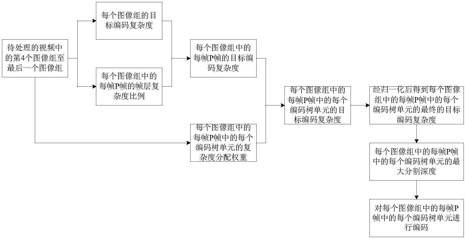 2.根据权利要求1所述的一种高效视频编码的复杂度控制方法,其特征在于所述的步骤④中 的获取过程为: 其中, 表示采用视频编码校验模型HM的原始方案并根据分割深度0对待处理的视频中的第2个图像组中的第k帧P帧中的每个编码树单元进行编码后、所有编码树单元各自所用的实际编码复杂度中的最小实际编码复杂度, 表示采用视频编码校验模型HM的原始方案并根据分割深度3对待处理的视频中的第2个图像组中的第k帧P帧中的每个编码树单元进行编码后、所有编码树单元各自所用的实际编码复杂度中的最大实际编码复杂度。