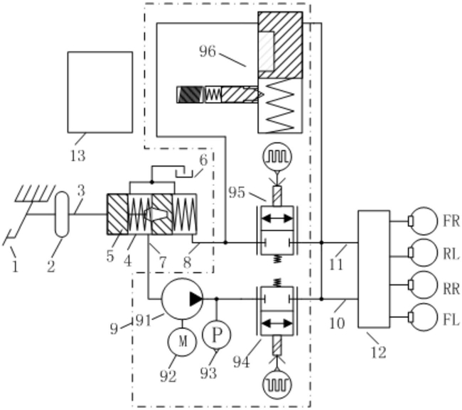 5.根据权利要求4所述的车辆电子液压制动系统,其特征在于:所述液压泵由泵电机驱动,所述进油阀和出油阀为常闭阀,所述增压控制单元输出PWM的占空比控制泵电机、进油阀和出油阀的开启时间。