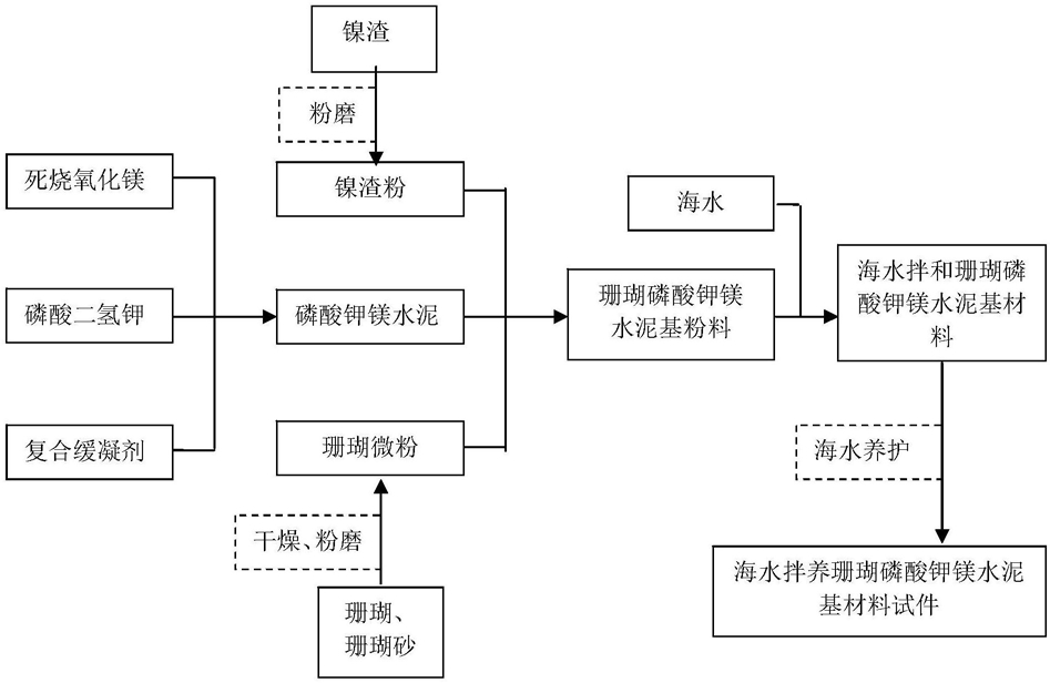 9.一种制造如权利要求1所述的海水拌和珊瑚磷酸钾镁水泥基材料的制备方法,其特征在于,其包括以下步骤:按质量百分数计,称取75%~90%磷酸钾镁水泥;5%~15%珊瑚微粉;以及5%~10%镍渣粉,混合均匀得到珊瑚磷酸钾镁水泥基粉料;