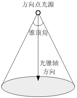 步骤S101:按照阴影映射方法的流程,把相机放在方向点光源所在位置,使相机的正前方向朝着方向点光源的光锥轴方向,使相机的视场角等于方向点光源的光锥的锥顶角,绘制三维场景以创建阴影图SM;