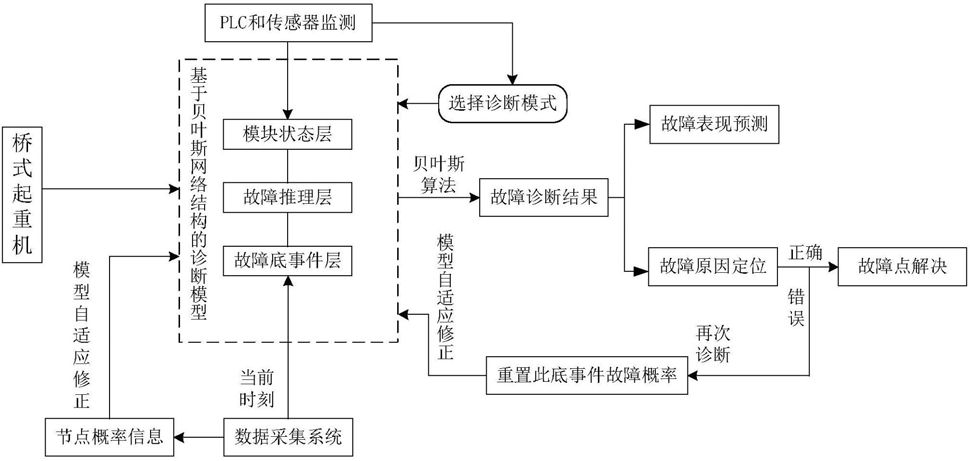 步骤三、采集模块状态层的输出信号,根据桥式起重机各模块是否正常运行选择故障诊断模式,具体是指利用传感器和PLC读取桥式起重机贝叶斯网络拓扑结构中模块状态层的状态信息,当模块状态层的信号显示正常时,代表桥式起重机仍可继续工作,此时故障诊断系统进入故障表现预测模式;当模块状态层某个模块传递的信号不正常时,则代表桥式起重机此模块运行故障,此时故障诊断系统进入已发故障的第一故障点定位模式;