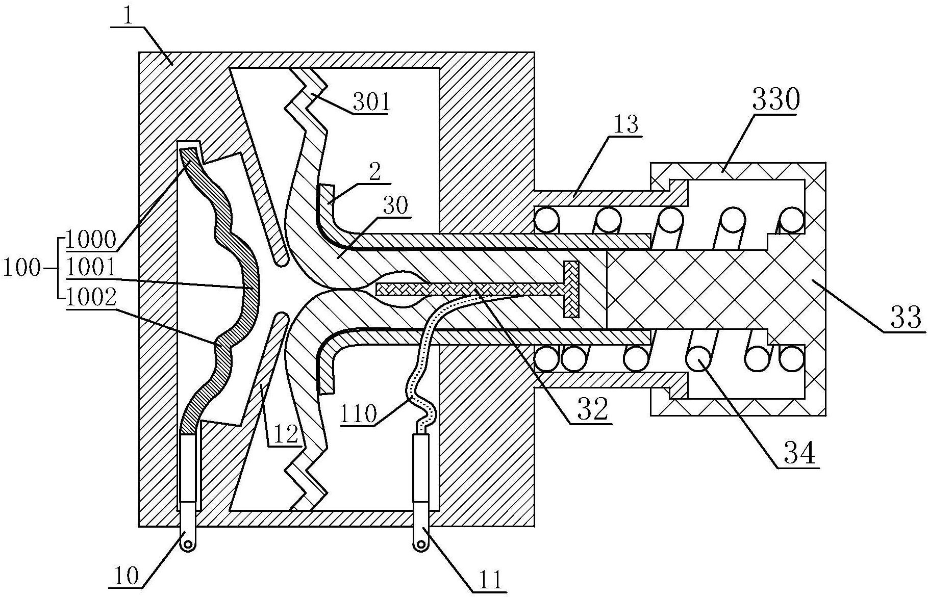 -所述壳体设有第一容腔和第二容腔,壳体内设有平行安装的第一接线端子(10)和第二接线端子(11),第一接线端子(10)末端设有第一接触部(100),第一接触部(100)位于第一容腔内;第二接线端子(11)末端设有与活动触头(32)电连接第二连接部(110),第二连接部(110)位于第二容腔内,活动触头(32)和硅胶皮碗(30)均位于第二容腔内;