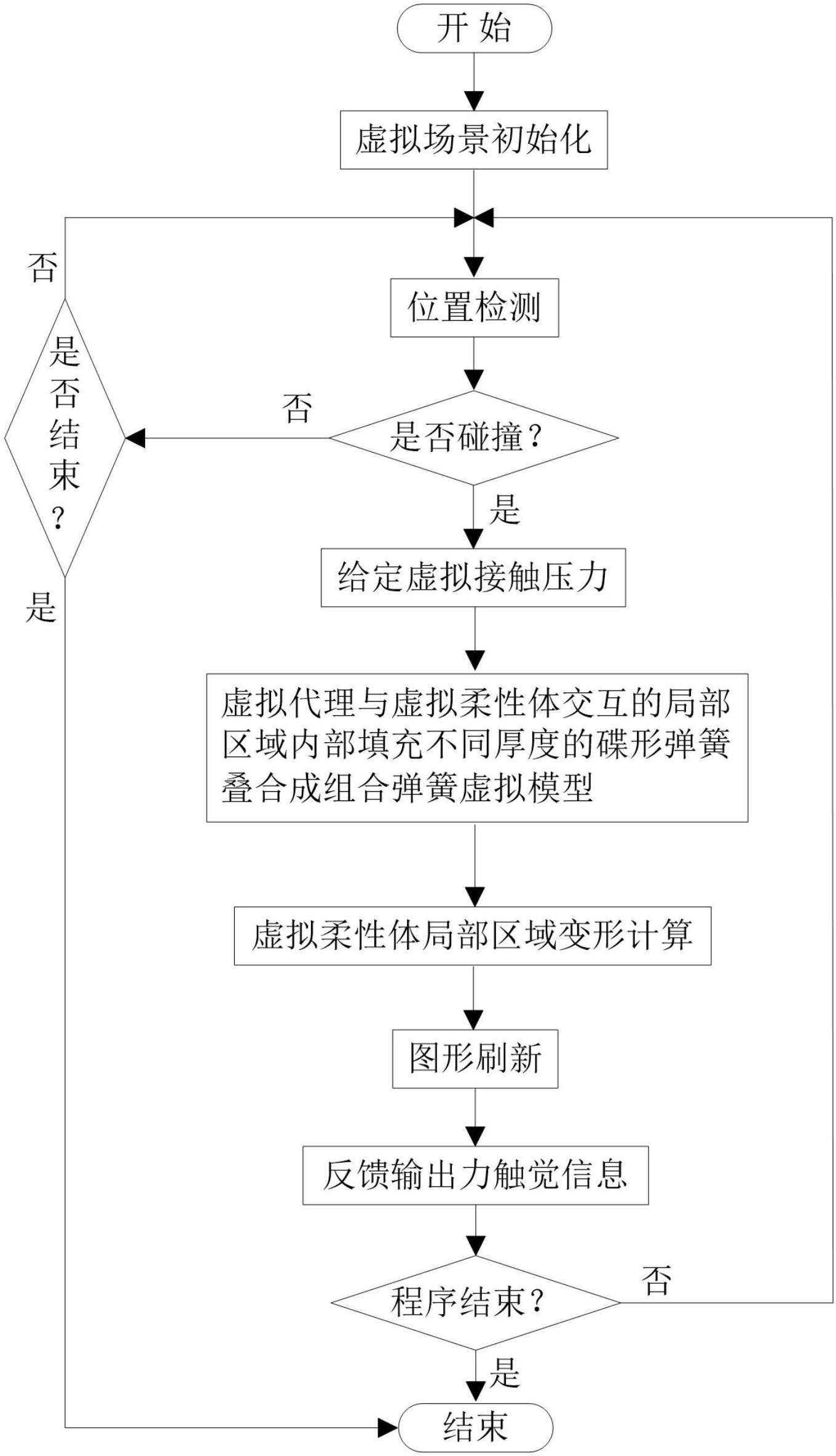 在给定虚拟接触压力F作用下,当虚拟代理碰撞到虚拟柔性体表面上的任意点时,在碰撞点处悬挂一外径为D、内径为d、厚度为t1、自由高度为H01、被压平时的最大变形量为h0、弹簧刚度为k1的单片碟形弹簧,形成第一层;在第一层的单片碟形弹簧下,同方向设置一外径为D、内径为d、厚度为t2、自由高度为H02、被压平时的最大变形量为h0、弹簧刚度为k2的单片碟形弹簧,形成第二层;在第二层的单片碟形弹簧下,同方向设置一外径为D、内径为d、厚度为t3、自由高度为H03、被压平时的最大变形量为h0、弹簧刚度为k3的单片碟形弹簧,形成第三层,依此类推,在第i层的单片碟形弹簧下,同方向设置一外径为D、内径为d、厚度为ti、自由高度为H0i、被压平时的最大变形量为h0、弹簧刚度为ki的单片碟形弹簧,形成第i+1层,i=