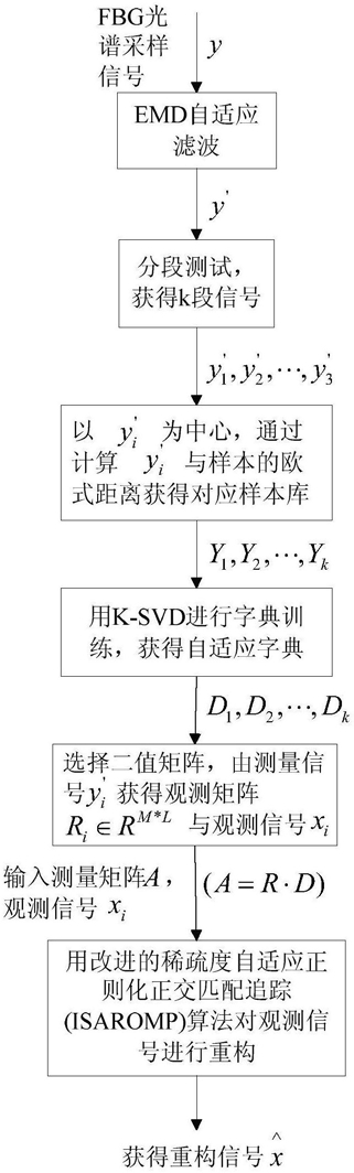 2.如权利要求1所述的基于压缩感知的FBG信号自适应修复方法,其特征在于:在步骤二中,所述获得对应信号的样本库,首先对信号进行分段测试,每段信号缺损数据的长度不能大于该段长度的50%或以上,具体范围根据实际情况做调整,以保证信号获得精确恢复;