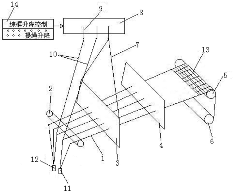 所述管经纱(1)分为I和Ⅱ两部分,相间排列,分别栓在第一张力重锤(11)和第二张力重锤(12)上,由第一张力重锤(11)和第二张力重锤(12)分别单独控制张力,所述第一张力重锤(11)和第二张力重锤(12)还分别系在重锤提绳(10)上,所述重锤提绳(10)挂在提综钩(9)上,随着提综钩(9)的升降同步控制第一张力重锤(11)和第二张力重锤(12)的升降;所述提综钩(9)与所述综框(3)之间通过综框提绳(7)连接;所述提综钩(9)安装在多臂提综箱(8)上,根据综框升降控制面板(14)上预置的上升和下降的指令使得综框(3)和第一张力重锤(11)和第二张力重锤(12)上升和下降。
