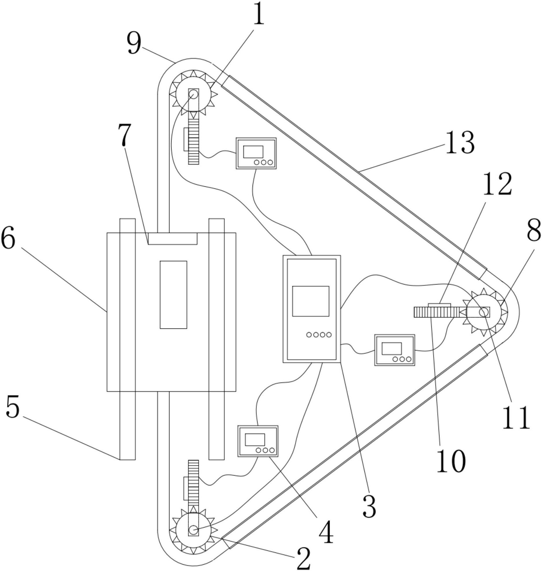 1.一种阀门耐火试验中的牵引装置,其特征在于:包括第一齿轮、第二齿轮、控制器和变频器,所述第一齿轮和所述第二齿轮之间设有轨道,所述轨道上设有试验轨道车,所述试验轨道车上设有贮水箱,所述轨道一侧还设有若干其他齿轮,所述第一齿轮、所述第二齿轮和所述若干其他齿轮依次通过链条相连接,所述链条两端分别固定在所述试验轨道车的前端和后端,所述第一齿轮、所述第二齿轮和所述若干其他齿轮上均连接有电机,所述电机的动力输出轴上均设有编码器,所述编码器均通过线缆与所述控制器相连接,所述电机上还设有减速器,所述变频器的输入接口与所述控制器连接,所述变频器的输出接口与所述电机连接。