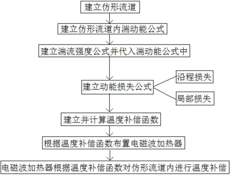 5)根据温度补偿函数T沿仿形流道的侧面设置多个电磁波加热源,磁波加热源沿仿形流道分布并正对仿形流道,电磁波加热源的分布疏密根据温度补偿函数来确定,通过电磁波加热源对仿形流道内各个位置进行加热;