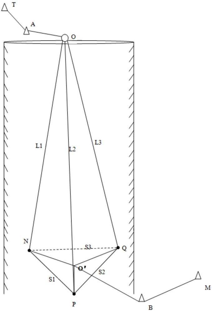 步骤二,在竖井底部选取三个固定点N、P、Q,三点位于同一水平面上,四个点O、N、P和Q形成一个三棱锥O-NPQ;在三个固定点N、P、Q处分别设置反光装置,用测距装置(3)分别测量三棱锥的三条斜边ON、OP和OQ的长度L1、L2和L3,用测量尺量出底边NP、PQ和QN的长度S1、S2和S3;