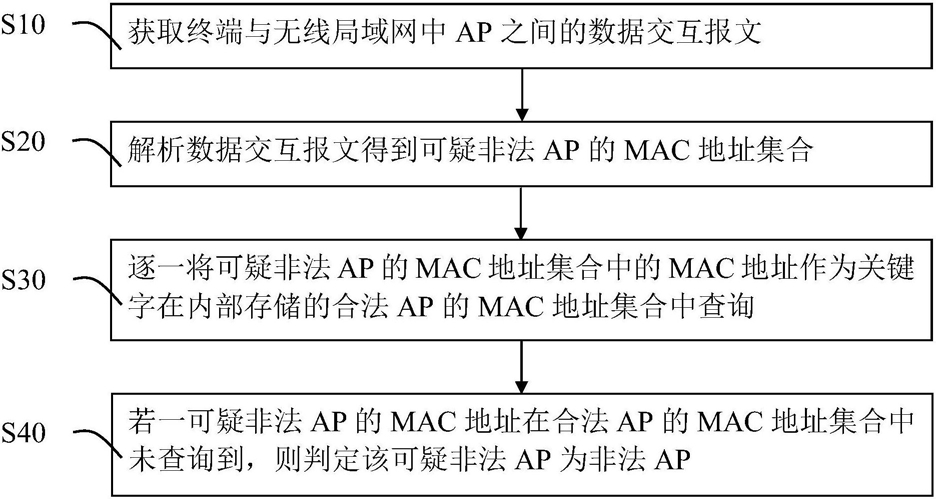 3.如权利要求1或2所述的非法AP监测方法,其特征在于,在步骤S40中具体包括:S41若一可疑非法AP的MAC地址在合法AP的MAC地址集合中未查询到,则根据该MAC地址向无线局域网中所有合法AP发送进一步查询请求;