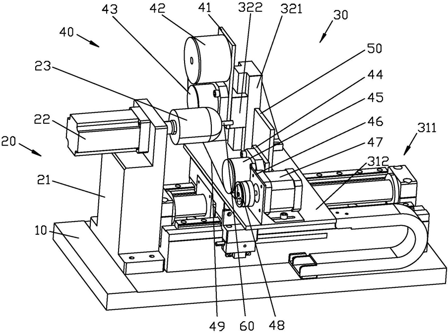 运丝机构包括张紧轮、第一导轮、第二导轮、第二驱动装置、贮丝筒及刮丝;张紧轮和第一导轮装接在滑块且可通过滑块沿上下方向往复运动;第二导轮设在工作台;第二驱动装置设在工作台,贮丝筒装设在第二驱动装置上;刮丝一端经第二导轮引导后卷绕在贮丝筒内,另一端经第一导轮引导后卷绕在张紧轮,第一导轮与第二导轮之间的刮丝悬空;