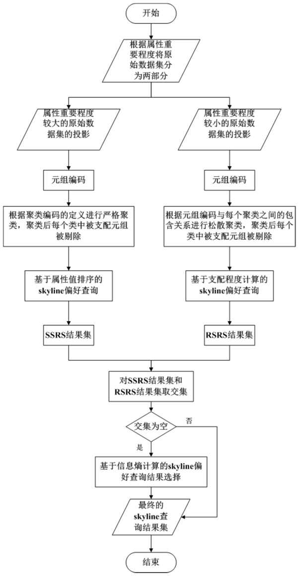 5.根据权利要求1所述的一种基于海量不完备数据集的skyline偏好查询方法,其特征在于:所述步骤(6)中执行支配程度计算skyline偏好查询算法,得到松散聚类结果集RSRS的具体过程如下:(6.1):松散聚类规则是对元组编码和聚类编码执行不完全匹配,凡是元组编码与聚类编码符合包含关系就认为该元组可以聚于这个类中;下面是对元组编码与聚类编码之间包含关系的定义:令d1=λ, pi″·tuplecode=Mi″,Mi″=(mik,mik+1,…,mid),如果并且i≠j,ccj=(cjk,cjk+1,…,cjd),对于 mik≤cjk,pi″被放在聚类编码为ccj的对应类中,pi″与ccj之间的包含关系用pi″→ccj表示;如果 对于 mik>cjk,那么ccj→pi″并且这个聚类的编码将被更新为pi″·tuple_code,ccj将被移出CS″;如果pi″·tuple_code与ccj之间没有包含关系或者CS″是空集;除pi″将被放于聚类编码为ccj这种情况之外,都要更新CS″;CS″=CS″∪{pi″·tuple_code},其中,CS”是松散聚类编码集合;