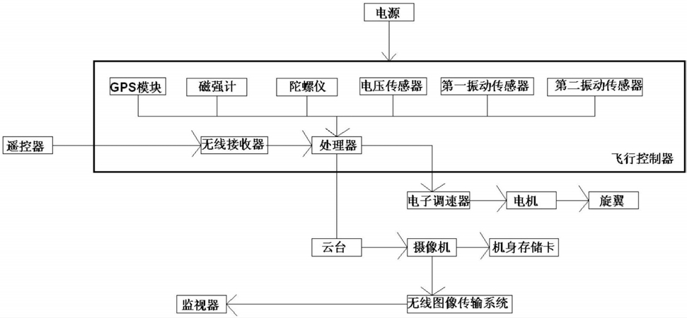 所述无线接收器用来接收所述遥控器发出的指令信号并将指令信号发送给所述处理器,所述GPS模块用来对多旋翼航拍飞行器进行定位并将生成的位置信号发送给所述处理器,所述磁强计用来测量多旋翼航拍飞行器所在位置的磁感应强度并将生成的航向信号发送给所述处理器,所述陀螺仪用来感应多旋翼航拍飞行器的水平方位、垂直方位、俯仰方位、航向和角速度并将生成的姿态信号发送给所述处理器;所述第一振动传感器安装在所述电机上,用来感应所述电机的振动强度并将生成的第一振动强度信号发送给所述处理器,所述第二振动传感器安装在所述云台上,用来感应所述云台的振动强度并将生成的第二振动强度信号发送给所述处理器;所述处理器对所接收的指令信号、位置信号、航向信号、姿态信号、第一振动强度信号和第二振动强度信号进行综合分析,并得到用于调整所述多旋翼航拍飞行器当前飞行姿态的的脉宽信号发于所述电子调速器,所述电子调速器再根据接收到的脉宽信号控制所述电机的转速。