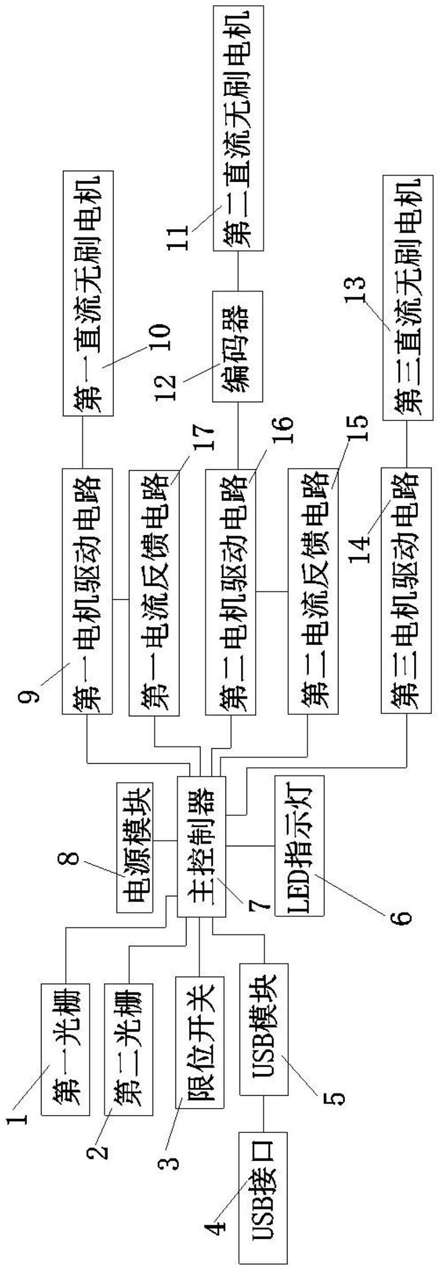 第一光栅(1)、第二光栅(2)、限位开关(3)、USB模块(5)、LED指示灯(6)、第一电机驱动电路(9)、第三电机驱动电路(14)、第二电流反馈电流、第二电机驱动电路(16)和第一电流反馈电路(17)均与主控制器(7)连接,USB接口(4)连接USB模块(5),第三直流无刷电机(13)连接第三电机驱动电路(14),第二直流无刷电机(11)连接编码器(12),编码器(12)连接第二电机驱动电路(16),第一直流无刷电机(10)连接第一电机驱动电路(9);