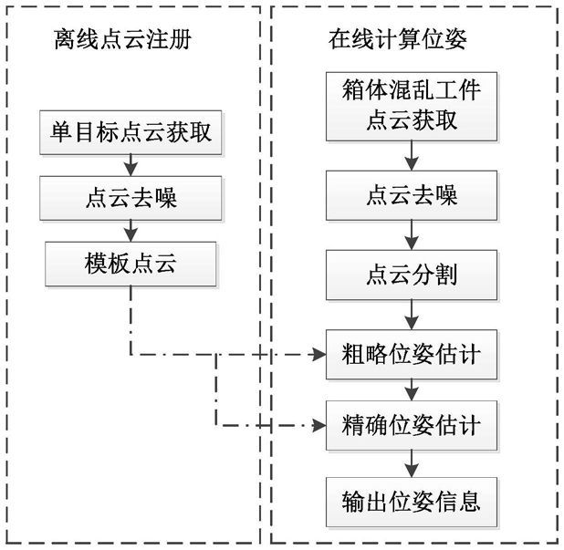 2)利用区域增长法对点云进行分割,得到各工件点云集,便于一对一地计算混乱工件位姿计;利用点法向量夹角作为区域的评判,利用曲率作为种子的评判;首先,计算所有点的曲率,将曲率最小的点作为区域生长起点即种子点;搜索种子点的邻近点,对于每一个邻近点,计算其法向量与当前种子点法向量的夹角,若该夹角小于阈值θ1,则将该邻近点归于当前区域,否则舍弃;计算当前区域剩余邻近点的曲率,若曲率小于阈值θ2,则将该邻近点添加到种子群中,并从种子群中移除当前种子;选择下一个种子点,重复上述步骤;当种子点群为空时,得到按法向量特征得到的点集;