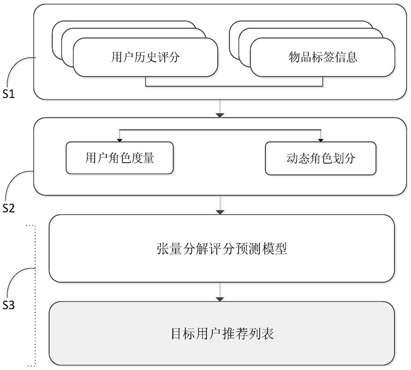 S32:利用经过动态化角色处理的评分数据,结合张量分解模型,得到用户对项目的预测评分,根据预测评分,使用排序算法对每个用户的评分进行从高到低的排序,得到最终用户-项目推荐列表。