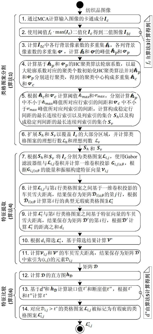 特征提取:将类格图案与Gabor滤波器组的滤波进行卷积,对卷积结果降维得到一维投影并计算其能量和振幅,根据能量和振幅计算特征向量;计算一维投影之间的车贝雪夫距离,挑选每行类格图案的典型无瑕疵类格图案,根据典型无瑕疵类格图案的特征向量计算理想特征向量;每个类格图案特征向量与理想特征向量间的车贝雪夫距离为所提取的特征;和特征比较:分析特征提取步骤中得到的基于特征向量的车贝雪夫距离直方图,获取表示有瑕疵的像素索引集合。