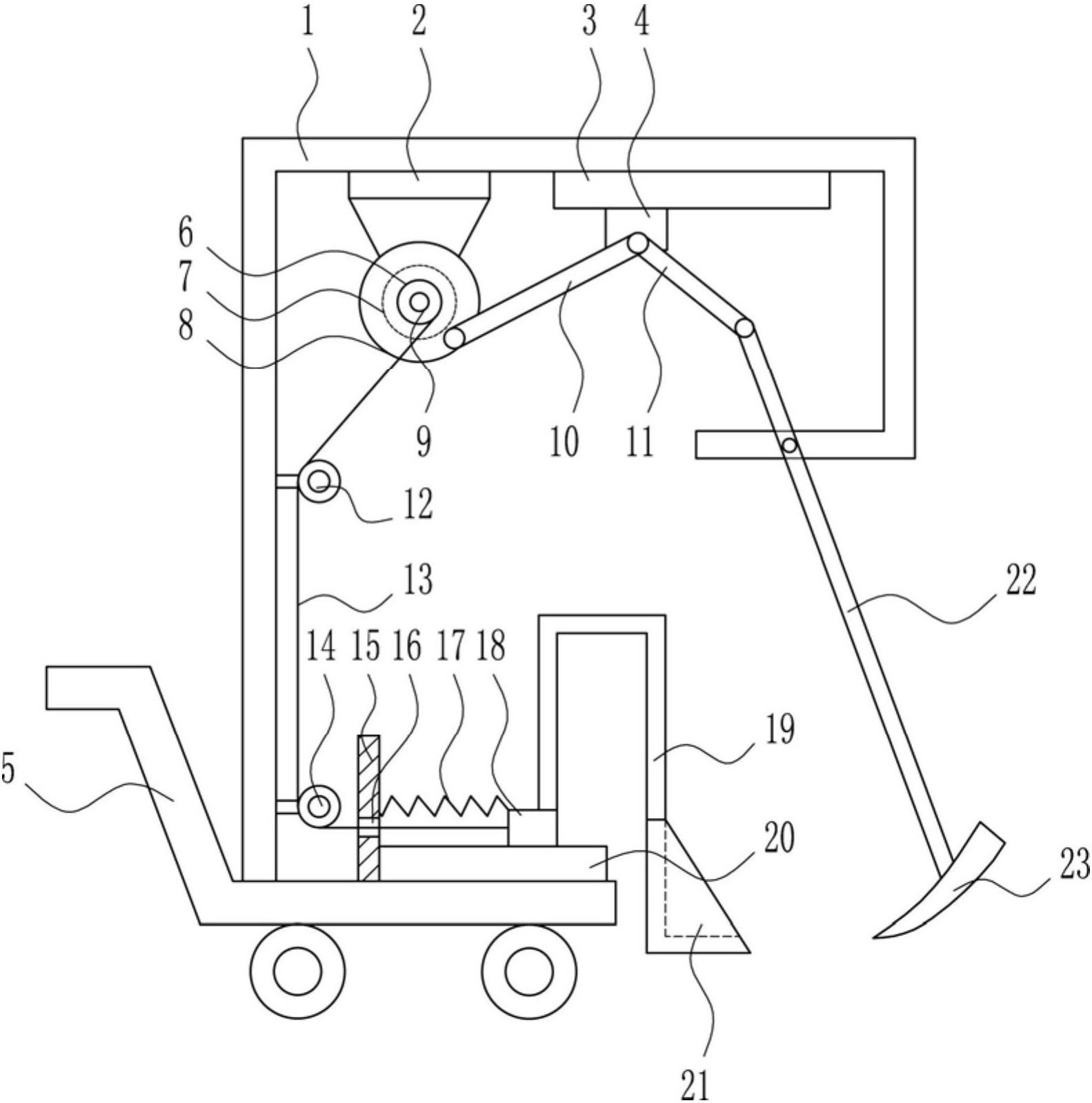 1.一种资源化技术矿石勘测用取样装置,其特征在于,包括有支架(1)、连接座(2)、第一滑轨(3)、第一滑块(4)、推车(5)、绕线轮(6)、旋转电机(7)、圆盘(8)、转轴(9)、第一摆动杆(10)、第二摆动杆(11)、第一定滑轮(12)、拉线(13)、第二定滑轮(14)、导向板(15)、弹簧(17)、第二滑块(18)、连杆(19)、第二滑轨(20)、取样斗(21)、第三摆动杆(22)和铲子(23);
