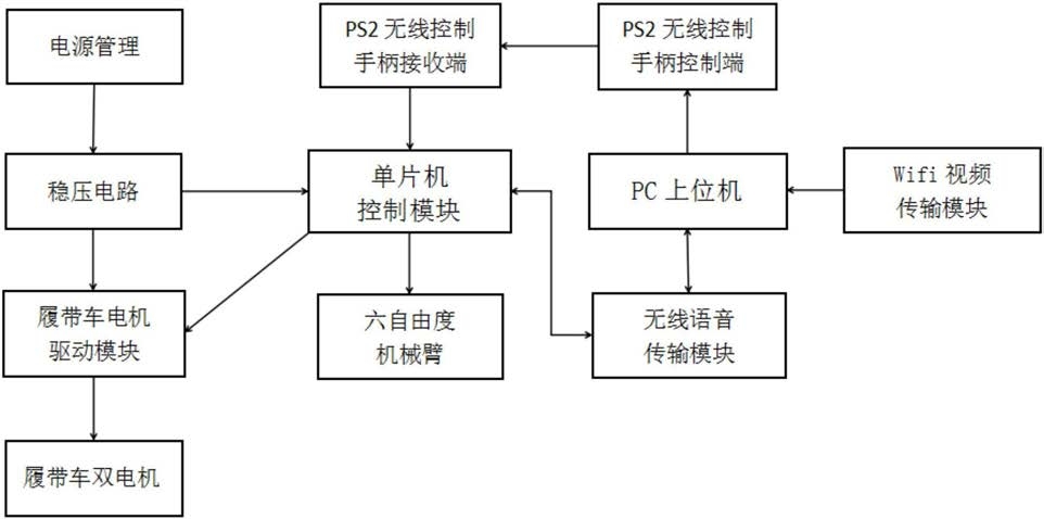所述单片机控制模块,设有PS2无线手柄接收端接口,用于连接PS2无线手柄接收端;还设有所述MG996R数字舵机接口,用于连接六自由度机械臂的六个MG996R数字舵机;所述单片机控制模块还用于控制履带车双电机驱动模块,进而控制履带车双电机;所述单片机控制模块,它包括STC12CA60S2单片机、LM2940稳压芯片、TB6612FNG电机驱动芯片;所述LM2940稳压芯片的电压输出端口3输出5V电压给STC12CA60S2单片机和TB6612FNG电机驱动芯片,STC12CA60S2单片机的引脚43连接TB6612FNG电机驱动芯片的引脚23,STC12CA60S2单片机的引脚41连接TB6612FNG电机驱动芯片的引脚22,STC12CA60S2单片机的引脚40连接TB6612FNG电机驱动芯片的引脚21,STC12CA60S2单片机的引脚1连接TB6612FNG电机驱动芯片的引脚17,STC12CA60S2单片机的引脚2连接TB6612FNG电机驱动芯片的引脚16,STC12CA60S2单片机的引脚44连接TB6612FNG电机驱动芯片的引脚15;所述STC12CA60S2单片机通过P00-P05 六个IO口连接六自由度机械臂的六个MG996R数字舵机,MG996R数字舵机从STC12CA60S2单片机处接收命令信号,执行相应动作,进而实现六自由度机械臂中某个维度的转动操作;所述STC12CA60S2单片机与履带车双电机驱动模块连接,用于控制履带车双电机驱动模块,进而控制履带车双电机;所述STC12CA60S2单片机上还设有PS2无线手柄接收端接口,用于连接PS2无线手柄接收端。