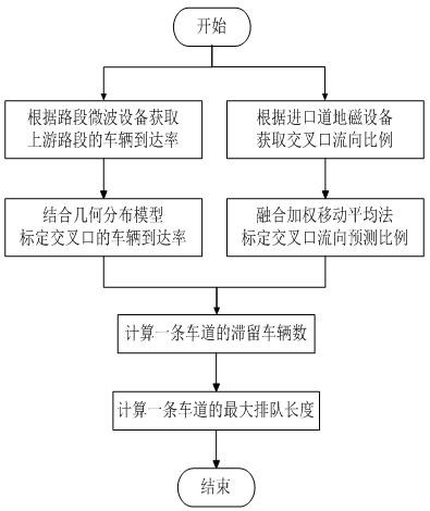 2.根据权利要求1所述的一种基于微波地磁数据的交叉口最大排队长度计算方法,其特征在于:所述步骤C)中计算一条车道的滞留车辆数时,利用求得的交叉口车辆到达率、融合后的流向预测比例,并结合绿信比、饱和流率,先求得某流向总的滞留车辆数,最后除以该流向的车道数,将总的滞留车辆数平均到一条车道上。