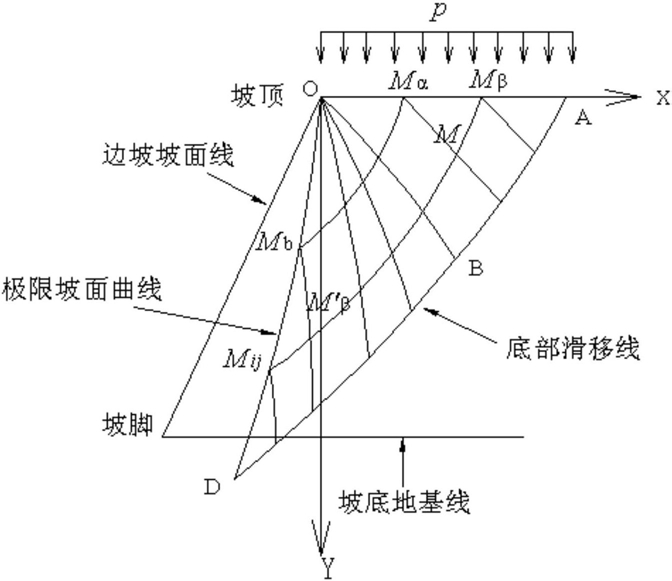 (1)对特定坡高H和坡角α,由滑移线场理论计算极限状态下的边坡坡面曲线,本发明统一简称极限坡面曲线,设坡顶为坐标原点,坡体一侧为x轴正半轴,向下为y轴正半轴;