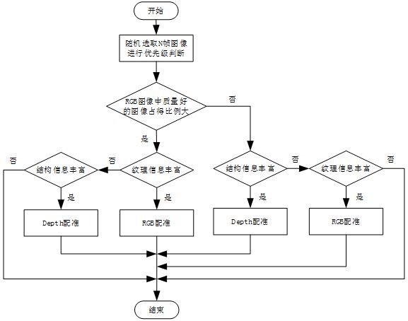 2D配准方法的优先级高时,则对RGB-D传感器获取到的RGB图像进行纹理信息判断,若α=1,则采用RGB配准方法;若α=0,则对RGB-D传感器获取到的RGB图像进行结构信息判断,若β=1,则采用Depth配准方法,若β=0,则抛弃该RGB-D传感器获取到的RGB图像;
