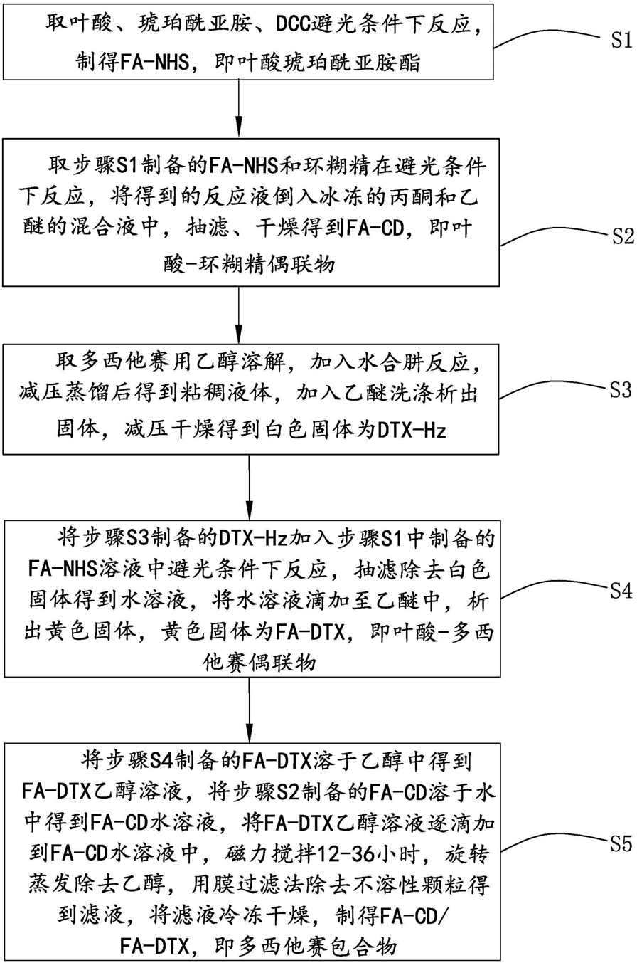 4.一种基于权利要求1~3任一所述的多西他赛包合物的制备方法,其特征在于,包括以下步骤:步骤一、取叶酸、琥珀酰亚胺、DCC避光条件下反应,制得FA-NHS,即叶酸琥珀酰亚胺酯;