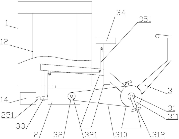 所述的固定架上设有前轴和后轴,所述的前轴上设有前链轮,所述的后轴上设有后链轮,所述的前链轮和后链轮之间通过链条传动连接,所述的前轴上设有踏板;