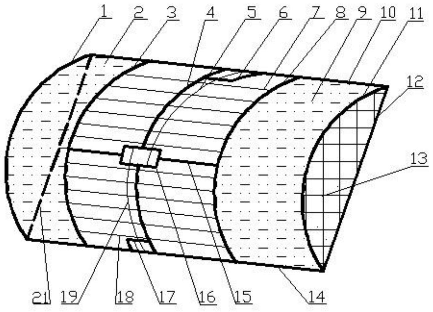 1.一种可调节农植物温室大棚,包括由前、后、左、右下边杆组成的方形底边框架和支架,所述底边框架与支架间设置保温膜,包括侧面和顶罩,其特征在于,左上边杆、左轨道杆、中间支撑杆、右轨道杆、右上边杆依次按照一定距离联接在底边框架的上方,它们都是圆弧形状,并在同一个圆弧面上;顶部连接杆为直线结构安装在左轨道杆圆弧、中间支撑杆圆弧、右轨道杆圆弧中间位置,所述左上边杆、左轨道杆、中间支撑杆、右轨道杆、右上边杆、顶部连接杆和底边框架共同组成半圆柱形的大棚支架;左覆盖膜、右覆盖膜分别覆盖在大棚支架上方左右两圆弧面上;前折叠保温膜支撑在左轨道杆、中间支撑杆、右轨道杆组成的圆弧面前侧,前折叠保温膜的下端边固定在前下边杆上,上端边与前绕线相连,能在前绕线的带动下沿左轨道杆、中间支撑杆、右轨道杆组成的圆弧面上下移动,前折叠保温膜上设置有平行分布的直线条,形成百叶窗帘结构;后折叠保温膜支撑在左轨道杆、中间支撑杆、右轨道杆组成的圆弧面后侧上,后折叠保温膜的下端边固定在后下边杆上,上端边与后绕线相连,能在后绕线的带动下沿左轨道杆、中间支撑杆、右轨道杆组成的圆弧面上下移动,后折叠保温膜上设置有平行分布的直线条,形成百叶窗帘结构;主绕线轮装置固定在前下边杆的中间位置,副绕线轮装置固定在后下边杆的中间位置,过渡绕线轮装置安装在中间支撑杆与顶部连接杆的交叉点上,所述主绕线轮装置、副绕线轮装置和过渡绕线轮装置包括能自由正反转动的转动轮,前绕线缠绕在过渡绕线轮装置的转动轮上,后绕线缠绕在过渡绕线轮装置的转动轮上,并且与前绕线在过渡绕线轮装置的转动轮上的缠绕方向相反。