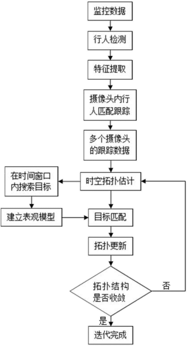 1.一种结合时空拓扑估计的跨摄像机目标匹配与跟踪方法,其特征在于:包括以下步骤:S1.将两两摄像机之间的转移概率初始化为M为监控网络中摄像机的数量;时间窗口设置为TW=τ,τ为预设值,两两摄像机间的转移计数器初始化为0;S2.设当前摄像机为Ci,摄像机Ci内的行人目标表示为Oi,a;在设定的时间窗口内搜索其他摄像机中出现的行人目标;S3.设在摄像机Cj中搜索得到的行人目标为Oj,b,i≠j,1≤j≤M,计算行人目标Oi,a、Oj,b之间的匹配概率:的转移次数;S8.根据步骤S7计算两两摄像机之间的转移概率;S9.记录摄像机Ci到摄像机Cj所有匹配的行人目标之间的时间间隔,构成时间序列Tij,然后利用自适应的Parzen窗算法估计出摄像机Ci与摄像机Cj之间的转移时间分布的概率密度曲线,取与曲线峰值对应的时间差值作为时间窗口大小T(Cj|Ci)的估计值;S10.根据步骤S9估算出两两摄像机之间的时间窗口大小;S11.更新摄像机Ci、摄像机Cj之间的转移概率:Pij(k)=(1-α)Pij(k-1)+αP(Cj|Ci)Pij(k)表示第k次迭代得到的摄像机Ci到摄像机Cj的转移概率,α是更新因子,0≤α≤1,P i j (k-1) 表示第k-1次迭代得到的摄像机C i到摄像机C j的转移概率,当k=1时,S12.根据步骤S11对两两摄像机之间的转移概率进行更新;S13.更新摄像机Ci与摄像机Cj之间的时间窗口:Tij(k)=(1-η)Tij(k-1)+ηT(Cj|Ci)其中Tij(k)表示第k次迭代得到的摄像机Ci与摄像机Cj之间的时间窗口,Tij(k-1)表示第k-1次迭代得到的摄像机Ci与摄像机Cj之间的时间窗口,当k=1时,Tij(k-1)=τ,η表示更新因子;S14 .判断是否达到了设定的迭代次数,若是则输出转移概率以及时间窗口估计值,完成拓扑结构估计,结束迭代,否则令k=k+1然后执行步骤S6~S14。2.根据权利要求1所述的结合时空拓扑估计的跨摄像机目标匹配与跟踪方法,其特征在于:步骤S3通过求取目标Oi,a、Oj,b所有图像对的平均表观相似度来表示目标Oi,a、Oj,b最终的表观相似度,即E[·]为期望函数;其中目标Oi,a、Oj,b