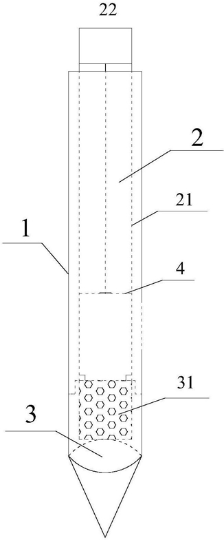 1.一种便携式土壤含水率测定仪,其特征在于:所述测定仪包括中空本体(1)、仪表装置(2)及锥形插件(3),所述的锥形插件(3)与中空本体(1)的下端成水密封固定连接,所述的仪表装置(2)可脱卸地固定在中空本体(1)远离锥形插件(3)的一方,所述的仪表装置(2)包括移动管套(21)、固定在移动管套上的位移传感器(22),所述的位移传感器(22)包括固定在移动管套上的位移传感器本体(221)、传感器数据连接线(222)、与传感器数据连接线连接的应变片(223),所述位移传感器本体(221)设有位移显示器和内置电源,所述的应变片固定在滑块(4)上,所述的滑块(4)与所述的移动管套(21)紧密配合;所述的中空本体(1)与锥形插件(3)连接的一端开设有样品通口(5),所述的移动管套(21)的底端超过所的样品通口(5)最低处,所述的滑块设在所述的样品通口(5)最高处的上方;所述的锥形插件上端部开设有膨润土贮存槽(31),底端成锥形,所述的膨润土贮存槽上端口与所述的中空本体成水密封紧密连接。