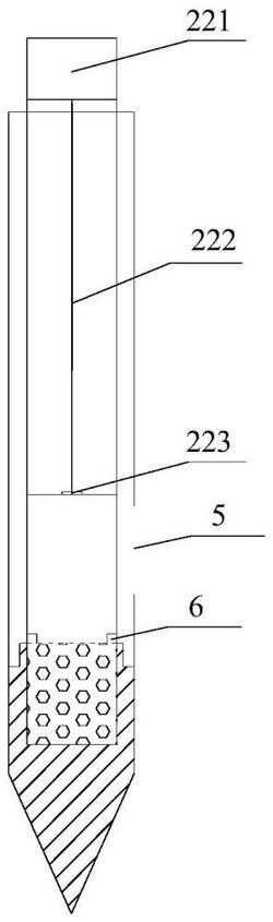 1.一种便携式土壤含水率测定仪,其特征在于:所述测定仪包括中空本体(1)、仪表装置(2)及锥形插件(3),所述的锥形插件(3)与中空本体(1)的下端成水密封固定连接,所述的仪表装置(2)可脱卸地固定在中空本体(1)远离锥形插件(3)的一方,所述的仪表装置(2)包括移动管套(21)、固定在移动管套上的位移传感器(22),所述的位移传感器(22)包括固定在移动管套上的位移传感器本体(221)、传感器数据连接线(222)、与传感器数据连接线连接的应变片(223),所述位移传感器本体(221)设有位移显示器和内置电源,所述的应变片(223)固定在滑块(4)上,所述的滑块(4)与所述的移动管套(21)紧密配合;所述的中空本体(1)与锥形插件(3)连接的一端开设有样品通口(5),所述的移动管套(21)的底端超过所述的样品通口(5)最低处,所述的滑块设在所述的样品通口(5)最高处的上方;所述的锥形插件上端部开设有吸水反应剂贮存槽(31),锥形插件的底端成锥形,所述的吸水反应剂贮存槽上端口与所述的中空本体成水密封紧密连接;所述的吸水反应剂贮存槽上端口设有固定移动管套的挡块(6);所述吸水反应剂为碳化钙。