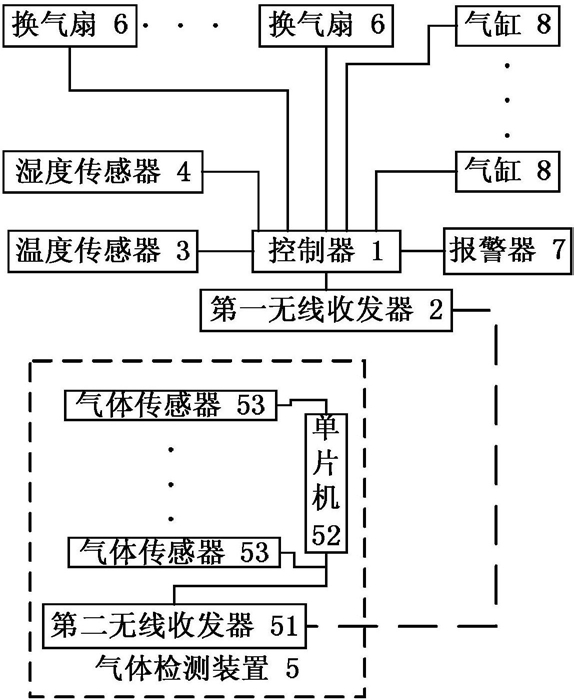 1.一种危化品毒害试剂检漏方法,其特征是,包括控制器(1)、第一无线收发器(2)、温度传感器(3)、湿度传感器(4)和m个气体检测装置(5);每个气体检测装置均包括第二无线收发器(51)、单片机(52)和10个气体传感器(53);控制器分别与第一无线收发器、温度传感器和湿度传感器电连接;每个气体检测装置的单片机分别与第二无线收发器和各个气体传感器电连接;各个气体传感器分别为SB-19-00传感器、SB-AD3-00传感器、TGS-2600传感器、SB-AQ1-06传感器、TGS-202传感器、TGS-813传感器、TGS-2620传感器、SB-42A-00传感器、TGS-822传感器、SB-11A-00传感器;所述仓库的围墙上部设有若干个换气扇(6),仓库外部设有报警器(7),气体检测装置均位于仓库的围墙下部;报警器和各个换气扇均与控制器电连接;