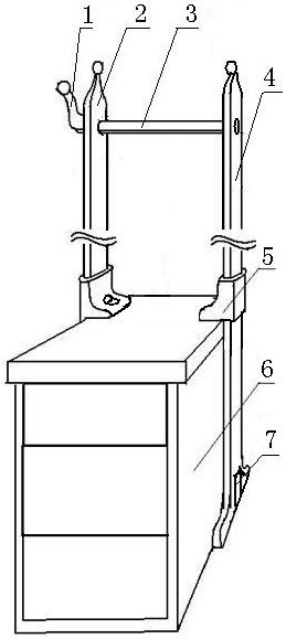 1.以床头柜为底座的组装衣架,由挂钩、左T形立柱、挂杆、右T形立柱、加固组件罩、床头柜、扁平底带、挂杆调节槽、挂杆孔、螺母、纵向调节孔、螺钉、长螺栓、圆台形穿孔、橡胶吸盘组、螺栓、长方形金属螺母片、插槽、锚垫、螺栓插孔、竖孔、尼龙搭扣组成,挂钩(1)固定在左T形立柱(2)的上部外侧,左T形立柱(2)和右T形立柱(4)的上部之间用挂杆(3)连接,左T形立柱(2)上部开挂杆孔(9),右T形立柱(4)上部开圆台形穿孔(14),圆台形穿孔(14)位置与左T形立柱(2)上部的挂杆孔(9)位置相对应,挂杆(3)一端制成圆台形、另一端头沿其纵轴开有纵向调节孔(11),螺母(10)内置在纵向调节孔(11)中、且在挂杆(3)端头附近,挂杆(3)从右T形立柱(4)外侧、圆台形穿孔(14)的大孔口穿过,挂杆(3)的圆台形端头卡合在圆台形穿孔(14)中,另一端穿至左T形立柱(2)上的挂杆孔(9)中,挂钩(1)内侧上部开有挂杆调节槽(8),挂杆调节槽(8)与左T形立柱(2)上的挂杆孔(9)相吻合,长螺栓(13)由挂钩(1)的上背部穿过挂杆调节槽(8),经左T形立柱(2)上的挂杆孔(9),再入挂杆(3)的纵向调节孔(11)与其中螺母(10)旋接,挂钩(1)的下背部用螺钉(12)与左T形立柱(2)固定,左T形立柱(2)和右T形立柱(4)的下端用扁平底带(7)紧系,扁平底带(7)置于床头柜(6)下面,扁平底带(7)一端固定在左T形立柱(2)下端,另一端装有尼龙搭扣(22)的一片,且与固定在右T形立柱(4)下端的尼龙搭扣(22)的另一片相扣合,其特征是:在左T形立柱(2)和右T形立柱(4)的中部各套裹、固定一加固组件罩(5),加固组件罩(5)制成马蹄形,其跟部开竖孔(21),孔形与T形立柱的杆形相吻合,竖孔(21)前内侧壁中下部沿中轴线开有插槽(18),长方形金属螺母片(17)插在插槽(18)中,螺栓(16)从加固组件罩(5)蹄面上的螺栓插孔(20)穿进插槽(18),且在插槽(18)中旋穿长方形金属螺母片(17),并顶压在锚垫(19)背面的中间凹处,锚垫(19)正面中央和四角各做一个凸起的小圆锥,锚垫(19)正面顶压在T形立柱上,加固组件罩(5)下面固定着橡胶吸盘组(15),橡胶吸盘组(15)吸附在床头柜(6)柜面上,使加固组件罩(5)附着在床头柜(6)柜面上。