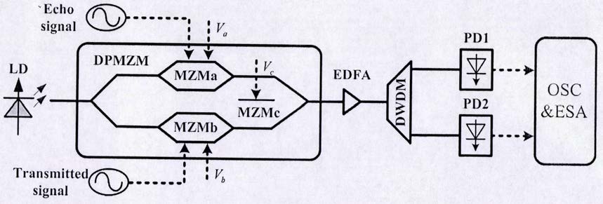 1.一种基于双平行马赫增德尔调制器DPMZM测量多普勒频移DFS的方法,包括激光二极管LD、DPMZM、掺铒光纤放大器EDFA、密集型波分复用器DWDM、光电探测器PD、电谱仪、示波器,其特征在于:电光调制器只采用一个DPMZM,回波信号和发送信号分别驱动调制器的上下臂,上下臂工作在最小点产生携带回波信号和本振信号的抑制载波双边带信号,DPMZM的主调制在上下臂引入45度相位差用于DFS正负的判定;DWDM将调制器输出的光信号的上下边带分别滤出并送入上下路的PD进行拍频;拍频得到的电信号送入电谱仪测量DFS的大小,并送入示波器比较两路信号的相位差判定DFS的正负;